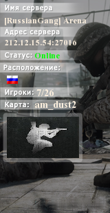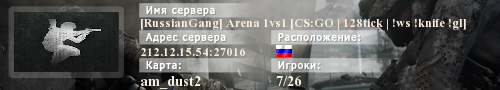 | Баннеры для сервера: [RussianGang] Arena 1vs1 [CS:GO | 128tick | !ws !knife !gl] | ||