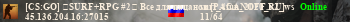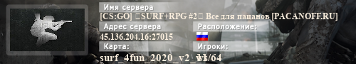 | Баннеры для сервера: [CS:GO] ★SURF+RPG #2★ Bce для пaцaнoв [PACANOFF.RU] | ||