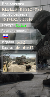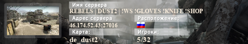 | Баннеры для сервера: REBELS | DUST2 | !WS !GLOVES !KNIFE !SHOP | ||