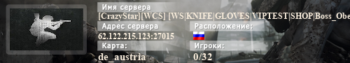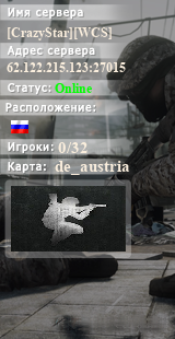 | Баннеры для сервера: [CrazyStar][WCS] [WS|KNIFE|GLOVES|VIPTEST|SHOP|Boss_Oberon] [500+RACES] | ||